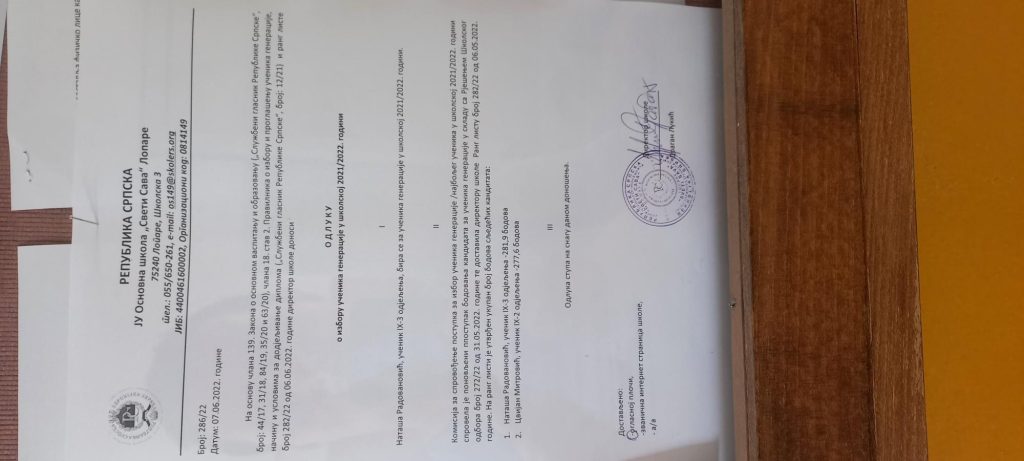 ОДЛУКА О ИЗБОРУ УЧЕНИКА ГЕНЕРАЦИЈЕ