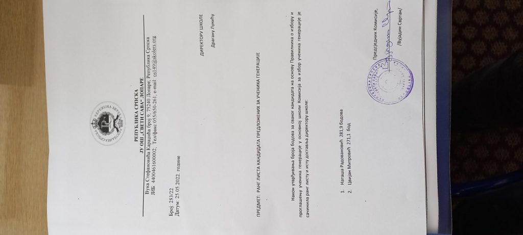 ОДЛУКА О ИЗБОРУ УЧЕНИКА ГЕНЕРАЦИЈЕ